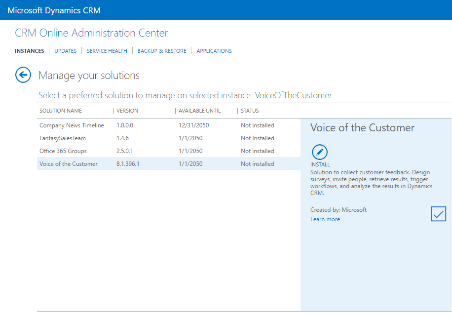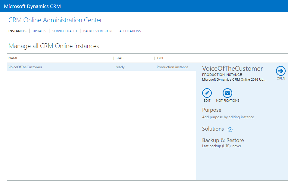 O passo seguinte será ativar a solução no Dynamics CRM. Abra sua instância digitando a URL da mesma, ou retornando à página inicial da Administração do CRM Online (botão com uma seta à esquerda ou clicando na palavra INSTANCES no menu superior) e em seguida pressionando o botão com seta à direita (OPEN) que fica à direita da tela.