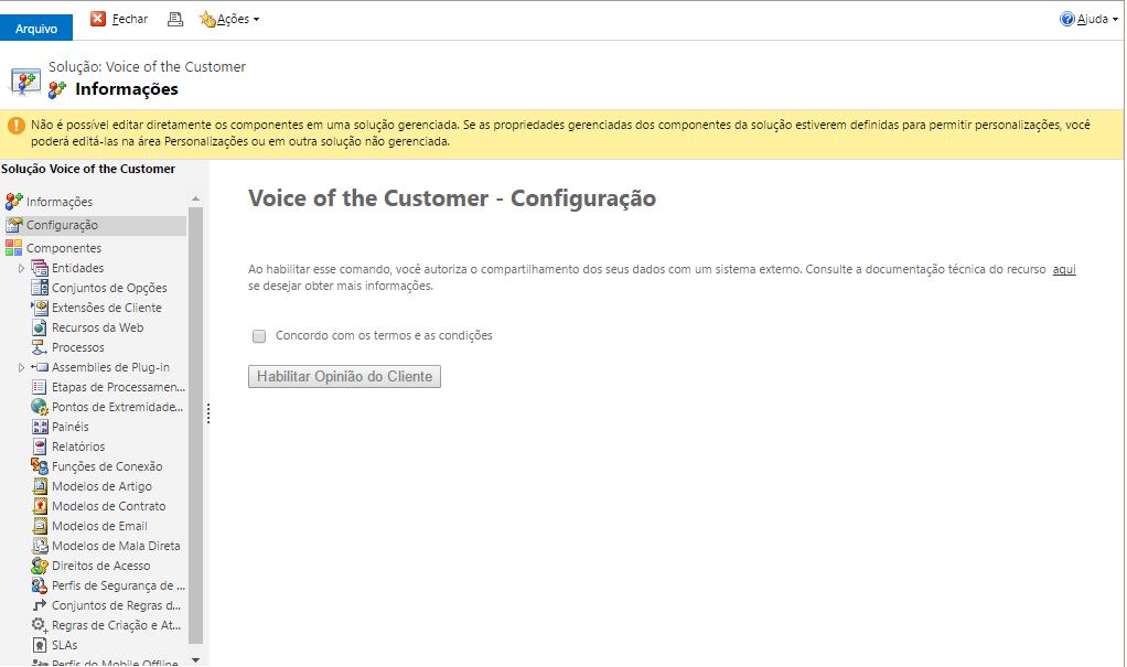 Já no Dynamics CRM, navegue para Configuração -> Personalização -> Soluções. Clique sobre o link do Nome de Exibição da solução “Voice of the Customer” para abrir a mesma. Para ativar a solução, é necessário marcar a caixa “Concordo com os termos e as condições” e pressionar “Habilitar Opinião do Cliente”.
